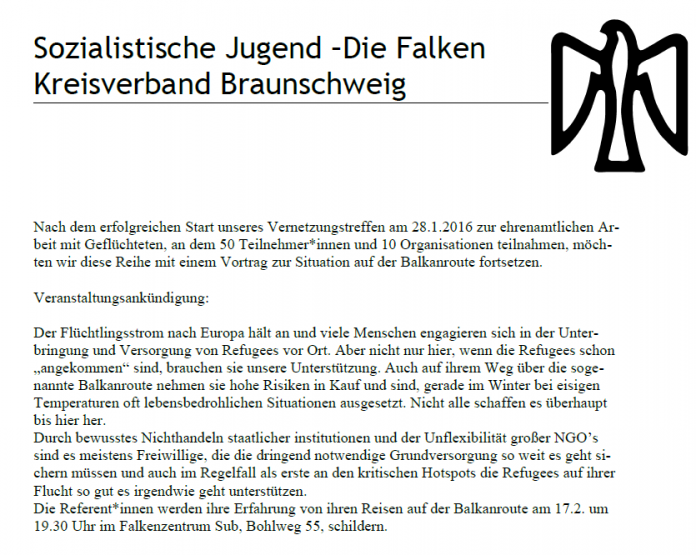 Veranstaltungsankündigung zur Hilfe an Flüchtlingen