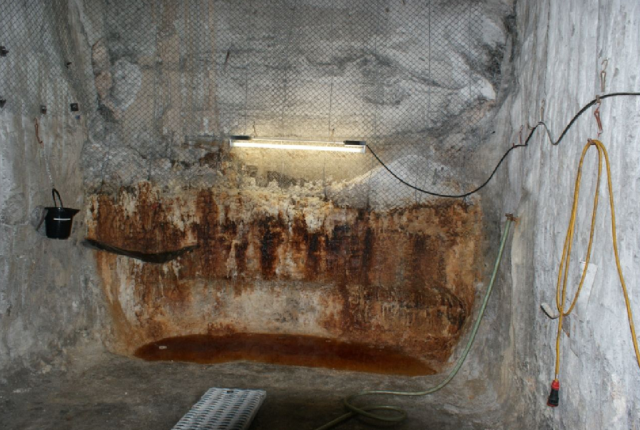 Atommüllkammer 10/750 und laufen durch die Kammer 9. Rostfarbene Partikel deuten auf eine Korrosion der Atommüll-Fässer. Nach der Verfüllung wäre unklar, wo die Laugen bleiben; sie könnten sich in der Einlagerungskammer aufstauen und den Atommüll vernässen oder ihn gar auflösen. (Foto: Ralf Krupp)