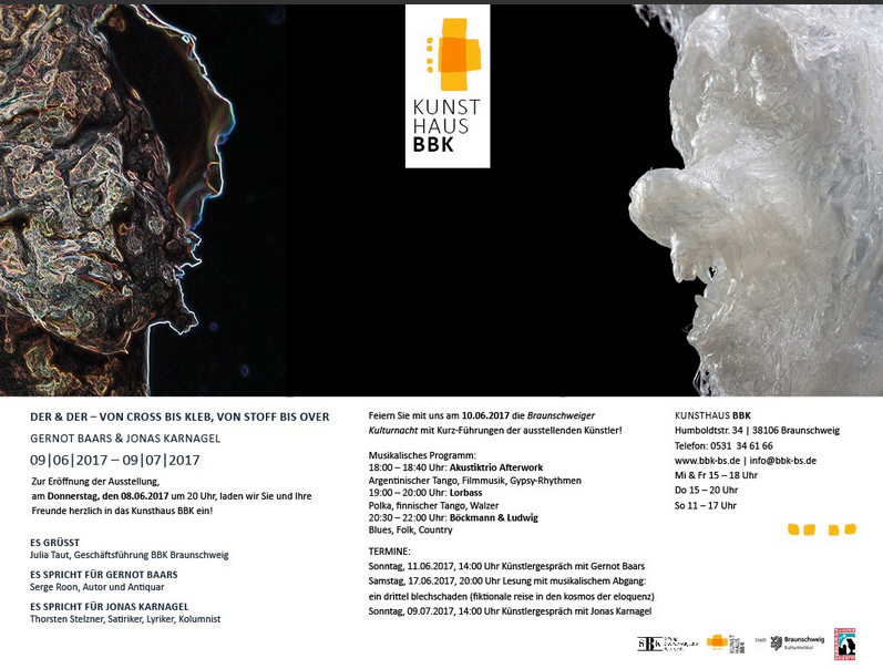 Im Kunsthaus BBK eröffnet am 08.06.2017 um 20 Uhr die Doppel-Ausstellung „der & der – von cross bis kleb, von stoff bis over“ der beiden Braunschweiger Künstler Gernot Baars und Jonas Karnagel.