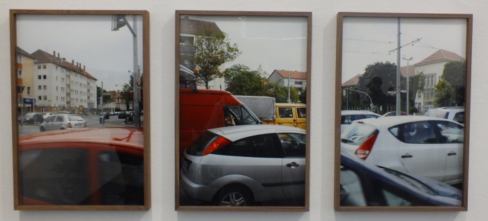 Dr. Bettina Lockemann, Professorin an der Braunschweiger HBK, fotografierte Straßenzüge und Plätze – vorwiegend Parkplätze – außerhalb der Innenstadt, am Ring, in der Südstadt, im Siegfried-Viertel, in Lehndorf. Immer mit Standpunkt auf dem Asphalt, teilweise aus der Perspektive der Windschutzscheibe. Im Wesentlichen menschenleer bis auf einige verschwommene Eindrücke im Inneren von Autos.