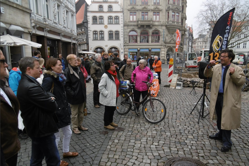 Die Weltlage hat sich zugespitzt. Am Freitag beschlossen einige Bürger, am Samstag wie in Frankfurt und Kiel bei uns auf dem Kohlmarkt mittags eine spontane Kundgebung zu machen. Am gleichen Abend beschlossen Thorsten Stelzner und Dieter Dehm anlässlich eines künstlerischen Abends, mitzumachen.