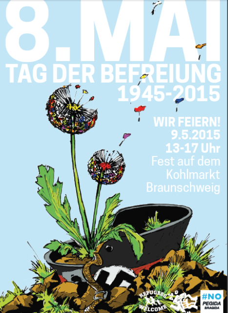 „In diesem Jahr jährt sich zum 70. Mal der 8. Mai 1945, der Tag an dem Nazi-Deutschland kapitulierte. Seit dem wird dieser Tag in vielen Länder Europas als Tag der Befreiung vom Faschismus gefeiert. Auch wenn damals für viele Menschen in Deutschland dieser Tag eher ein Tag der Niederlage war, die Städte in Trümmern lagen, und das Land von den Allierten besetzt war, markiert dieser Tag einen Neubeginn. Für die Menschen in den von der Wehrmacht überfallenen Ländern, für die Überlebenden aus den Arbeits- und Vernichtungslagern, für Zwangsarbeiter, für die GegnerInnen des NS-Regimes und für viele andere Menschen die von den Nazis unterdrückt und verfolgt wurden, war, ist und bleibt dieser Tag ein Tag der Befreiung. In den letzten Wochen sind wir mit vielen hunderten, ja tausenden Menschen gemeinsam gegen die islamfeindliche und rassistische BRAGIDA auf die Straße gegangen und haben für eine bunte, tolerante und antirassistische Stadt demonstriert.