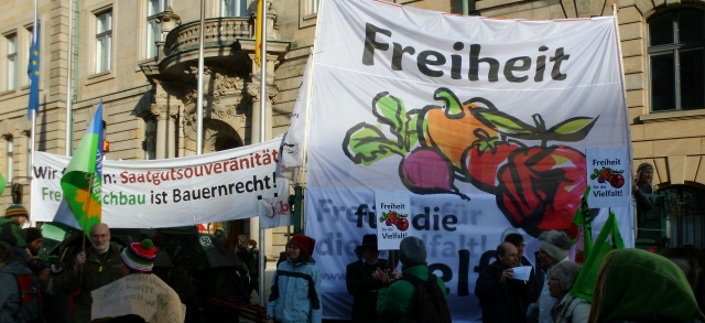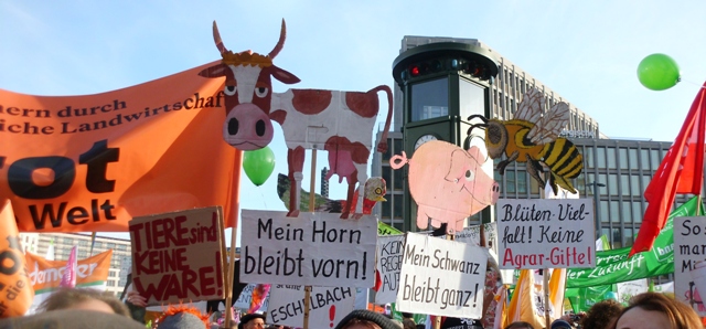 Jährlich findet unter dem gleichen Motto „Wir haben es satt“ zu Beginn der Grünen Woche diese Demo statt. Und jährlich werden es mehr. Diesmal etwa 30.000 Demonstranten – und darunter sehr viele junge Menschen. Es ging, und das ist bemerkenswert, auch um die Produktionsknechtschaft vieler konventionell wirtschaftender Bauern. Knechtschaft, weil sie von der Agrarchemie, den Futtermittelimporten und den Banken abhängig sind. Die Freiheit der Bauern muss wieder erkämpft werden. Thema war auch immer wieder das Freihandelsabkommen der EU mit den USA. Es wird komplett abgelehnt, weil es nur Chlorhühnchen, Hormone im Fleisch und Gentechnik auf den EU-Äckern bedeuten könne.