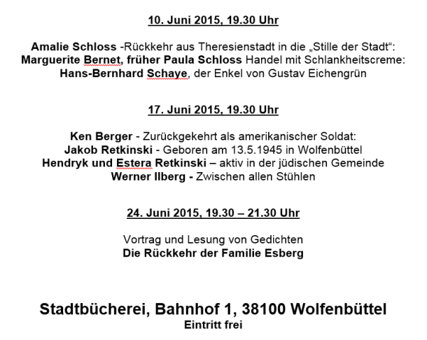 An drei Abenden wird das Schicksal nach Wolfenbüttel zurückgekehrter Juden und zum Umgang mit Erinnerung in Wolfenbüttel nach 1945 an konkreten Einzelfällen aufgezeigt.