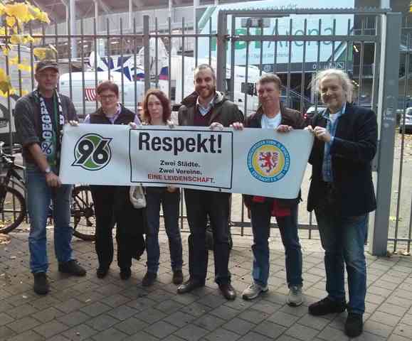 Fußball ist pure Leidenschaft. Fast immer. Das ist bei Derbys zwischen Hannover 96 und Eintracht Braunschweig nicht anders. Um gerade den Spaß am Fußball zu betonen, trafen sich am letzten Samstag (26.10.2013) Fans von Eintracht und 96 schon im Vorfeld des mit Spannung erwarteten Nordderbys (08.11.2013) in Hannover. Für diese Fans, die nebenbei auch ihre Partei in den Stadträten von Hannover und Braunschweig vertreten, war das Spiel Hannover gegen Hoffenheim eher Nebensache. Sie präsentierten vor und im Stadion ein Banner mit der Losung „Respekt! Zwei Städte. Zwei Vereine. EINE LEIDENSCHAFT“. Die Zuschauerinnen und Zuschauer reagierten erfreut bis aufmunternd. Die Idee zum Banner entstand aus der Respekt-Initiative des HSC Leu 06 Braunschweig, an der sich bereits viele Fußballvereine in Braunschweig und andernorts beteiligen (die BZ berichtete).